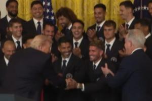 随后,特朗普又谈到美职联总决赛,提及德保罗进球时特朗普表示:“温哥华白浪将比分扳成1-1平后,梅西断下了温哥华白浪后卫的球,传给了伟大的德保罗。德保罗在哪儿?(转身与德保罗握手)你们队里有长得不好看的球员吗?我更喜欢那些不好看的家伙。”