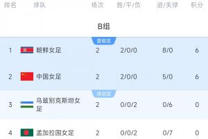 在小组积分榜上,朝鲜女足与中国女足已经提前一轮出线,末轮两队将直接交手争夺小组头名;中国女足目前落后朝鲜3个净胜球,只有战胜对手才能拿到小组第一。