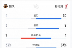 关于利物浦3-1狼队数据:射门20-4,射正9-3,得分机会1-1,角球11-0,当前阶段的情况已基本明朗。