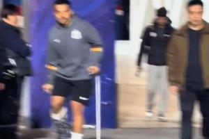 现阶段遭盖伊误伤!李可赛后拄拐离开球场,右脚穿戴脚踝固定支具的相关动态如上,后续发展值得持续关注。