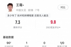 体育资讯3月9日讯 女足亚洲杯B组第三轮,中国女足2-1逆转朝鲜女足,小组头名出线,王霜首发出战打满全场,获评7.3分。