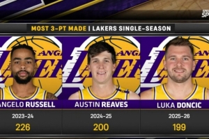 关于湖人队史单赛季三分命中纪录:拉塞尔226记居首 本赛季东契奇第3,当前阶段的情况已基本明朗。