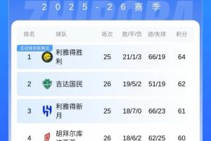 目前沙特联最新积分榜上,利雅得胜利64分领跑,吉达国民和利雅得新月分列二三位。