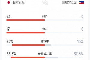 全场比赛数据日本女足可以说是全方位碾压对手,射门多达43脚,其中17脚射正,控球率也高达85%,传球成功率88.3%。此外,日本女足还获得了17次角球机会。菲律宾女足方面,全场她们未能完成一脚射门,控球率也仅有15%。