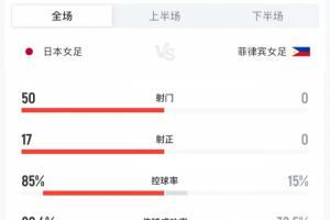 全场比赛数据日本女足可以说是全方位碾压对手,射门多达50脚,其中17脚射正,控球率也高达85%,传球成功率88.3%。此外,日本女足还获得了17次角球机会。菲律宾女足方面,全场她们未能完成一脚射门,控球率也仅有15%。