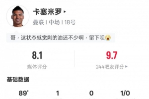 体育资讯3月15日讯 英超第30轮,曼联主场迎战维拉,卡塞米罗首发出战,打进1粒进球,送出1次关键传球,还有3次解围,1次拦截和1次抢断,评分8.1。