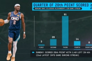 随着相关信息不断披露,恐怖如斯!SGA连续128场20+分布图:114次前三节拿到 末节14次的情况逐渐清晰。