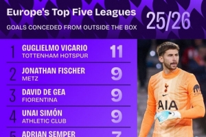 关于本赛季五大联赛门将禁区外失球榜:维卡里奥11球最多,德赫亚9球,当前阶段的情况已基本明朗。