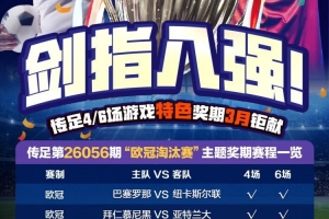 第26056期传足4/6场游戏特色奖期已经于2026年3月15日20:00开售,将于2026年3月18日22:00停售,并于2026年3月19日开奖,其中巴塞罗那VS纽卡斯尔联、拜仁慕尼黑VS亚特兰大、利物浦VS加拉塔萨雷、托特纳姆热刺VS马德里竞技为4场进球游戏竞猜赛事。