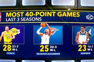 随着相关信息不断披露,近3个赛季40+场次排名前三:东契奇28场 SGA25场 华子23场的情况逐渐清晰。