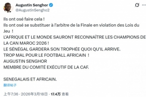 体育资讯3月18日讯 前塞内加尔足协主席、非洲足联执委会成员桑格尔社媒发文,怒斥剥夺塞内加尔2026年非洲杯冠军的决定。