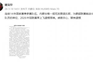 今日下午,内蒙古草上飞俱乐部总经理姚志强在社媒发文:“连续14年国家赛事参赛队伍,内蒙古唯一规范发展俱乐部,为蒙超联赛输送60名队员的单位,2026中冠联赛草上飞遗憾落榜。感谢关心,聊表遗憾。”
