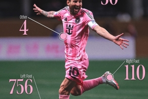 作为一名左脚将,梅西900球有756球是通过左脚打进,另外他右脚打进110球,30次头球破门,身体其他部位则打进4球。