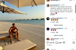 葡萄牙父亲节之际,乔治娜社媒晒出C罗的照片,配文:“祝孩子们最好的爸爸节日快乐。感谢你每天照顾我们、引导我们,用爱填满我们的生活。你是我们的光。愿上帝永远保佑你。我们永远爱你。”