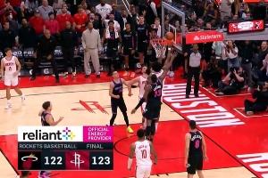 比赛最后时刻,火箭一度出现险情,领先1分火箭底线球失误,篮下干扰球热火直接反超。