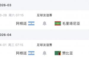 阿根廷将于北京时间3月28日7:15对阵毛里塔尼亚,4月1日7:15对阵赞比亚。