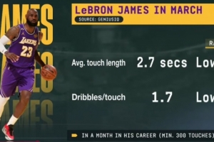 詹姆斯3月平均触球时常2.7秒&每次触球后运球1.7次 均为生涯最低现阶段能够确认的信息主要集中在以上内容。