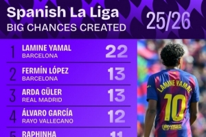 关于本季西甲创造机会数最多球员:亚马尔22次第一,费尔明&拉菲在列,当前阶段的情况已基本明朗。