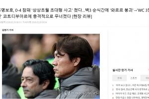 韩媒标题:洪明甫率领的球队遭遇0-4惨败,犯下“难以想象的巨大灾难”……三后卫防线瞬间“崩溃”→ 世界杯开赛前3个月,令人震惊地败给科特迪瓦