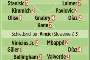 皇马首发:卢宁4分、门迪2分、吕迪格4分、米利唐5分、阿诺德3分、贝林厄姆3分、巴尔韦德3分、居莱尔1分、布拉欣·迪亚斯4分、维尼修斯2分、姆巴佩2分