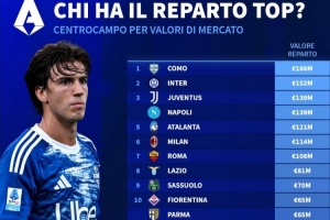 关于德转列意甲各队中场总身价排行:科莫1.66亿欧居首,国米第二,当前阶段的情况已基本明朗。