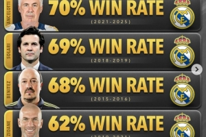 体育资讯4月16日讯 在欧冠淘汰赛次回合,皇马3-4不敌拜仁遭淘汰,本赛季面临可能四大皆空的局面。数据网站Score90也盘点了皇马近6位主帅胜率榜,具体如下: