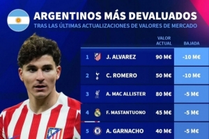 关于阿根廷球员身价下跌榜:阿尔瓦雷斯、罗梅罗下跌1000万欧最多,当前阶段的情况已基本明朗。