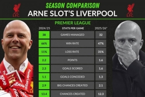 关于斯洛特两赛季英超表现:胜率-19%、负率+20%,场均进球2.3→1.6,当前阶段的情况已基本明朗。