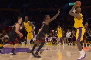 突施冷箭!詹姆斯弧顶加长三分轰进 率队保持两位数领先