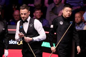 体育资讯4月19日讯 斯诺克世锦赛首轮,丁俊晖对阵吉尔伯特。在第一阶段上半场3-2,休息回来后丁俊晖连下4局,暂时7-2领先!