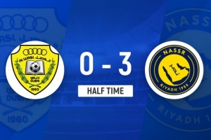 伤停补时4分钟。上半场比赛结束,利雅得胜利3-0迪拜祈祷。