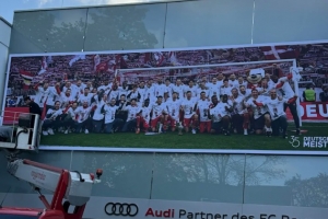 拜仁提前4轮获得本赛季德甲冠军,媒体指出,巨大的夺冠照片出现在拜仁训练基地的外墙上,取代了合作伙伴奥迪的广告牌。