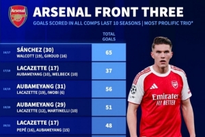 23-24赛季:51球(萨卡20球、特罗萨德17球、哈弗茨14球)