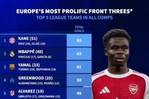 体育资讯4月22日讯 《转会市场》统计了本赛季五大联赛各队三叉戟进球情况,拜仁断崖领跑、皇萨分列二三,阿森纳仅位列第13位。