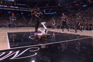 GIF-文班倒地之后侧脸狠狠摔在地板上了 有点难受啊 回更衣室了