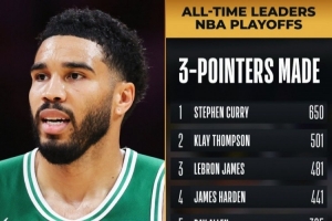 本场投进2个三分后,塔图姆生涯季后赛三分命中数来到了295个,超越JR·史密斯升至历史第十。