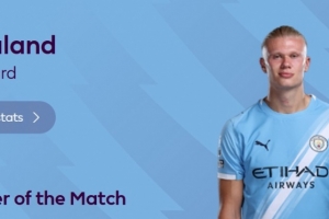 本场比赛哈兰德首发出场,打进全场唯一进球,赛后他也当选英超官方球迷票选全场最佳球员。