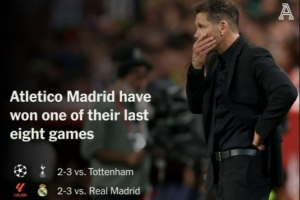 据统计,马竞在近8场各项赛事中仅一次获胜,就是欧冠淘汰赛首回合客场2-0击败巴萨,此外的比赛1平6负。