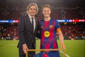 本场比赛德容替补登场,这是他第293次为巴萨出场,超越名宿科库成为队史出场最多的荷兰球员。赛后科库也为德容颁发了纪念球衣,并合影留念。