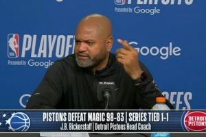 比克斯塔夫:“不,不,我们对阵的是一支优秀的球队。如果这支球队在整个赛季大部分时间保持健康,他们绝对不止排在第八名,他们是一支非常有天赋、非常出色的篮球队。但话虽如此,我觉得即使在第一节,我们也有扩大领先优势的机会,只是没能把握住。季后赛从来都不轻松,但你必须保持稳定。如果你能找到这种稳定性,再加上我们所拥有的天赋水平,你就能找到扩大领先优势的机会,然后再防下一个回合,把优势拉得更大。这是我们的重点。我们非常尊重那支球队,尊重他们的教练团队以及他们的打球方式。但同样,如果我们打出属于我们的活塞篮球,我们觉得自己能击败任何人。”