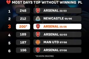 最近一段时间,英超领跑天数最多但未能夺冠排行:阿森纳曾3次上榜,最多248天被频繁提及,相关内容也在持续更新中。