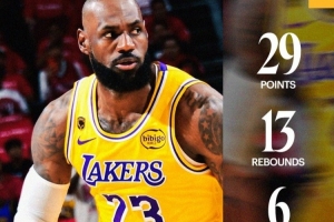 此役,詹姆斯出战45分4秒,投篮22中10,三分9中4,罚球6中5,得到29分13篮板6助攻3抢断1盖帽7失误。