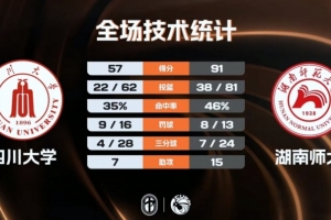 末节比赛,由于场上分差很大,湖南师大放缓了自己进攻的节奏,但四川大学依旧无法获得任何迫近比分的机会,分差反而继续达到30分,比赛早早就失去了悬念,最终湖南师大91-57大胜四川大学。