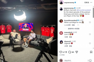 鲁尼社媒晒出采访曼联中场B费的照片,配文:“与B费在最新一期播客节目中进行了精彩的对话,他是个很棒的人,更是一位出色的球员,他应该赢得(英超)年度最佳球员奖项。”