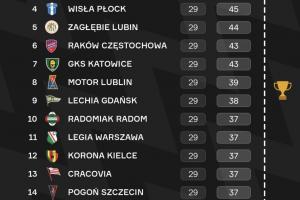 本赛季波兰联赛,在联赛还剩5轮的情况下18支球队有16支球队理论上都可以夺冠,这其中包括身处降级区的第16名。