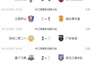 体育资讯04月25日讯 中乙预赛阶段第5轮,今日7场比赛结束。其中厦门飞鹭2-1战胜武汉三镇B队,深圳二零二八3-1战胜广东铭途。