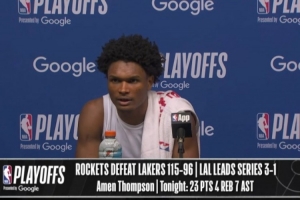 体育资讯4月27日讯 在今天结束的一场季后赛中,火箭以115-96战胜湖人。赛后,火箭球员阿门·汤普森出席了新闻发布会。以下是完整版采访内容。
