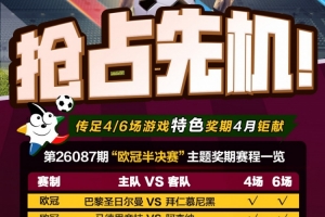 第26087期传足4/6场游戏特色奖期已经于2026年4月26日20:00开售,将于2026年4月28日22:00停售,并于2026年4月30日开奖,其中巴黎圣日尔曼VS拜仁慕尼黑、马德里竞技VS阿森纳、南安普敦VS伊普斯维奇、里斯本竞技VS通德拉为4场进球游戏竞猜赛事。