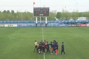 上半场比赛结束时,泰山U20暂0-1落后陕西联合U20,裁判走下场时,泰山U20主帅崔鹏疯狂向主裁表示不满,大声怒骂“SB”、“CNM”,裁判短时间内向其连续出示两张黄牌,红牌将其罚下。