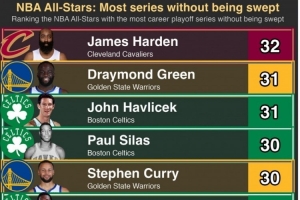 截至目前,从未被横扫过的球员谁打的系列赛最多?哈登32轮第1 追梦2库里4的相关情况大致如此,后续仍需关注进一步消息。